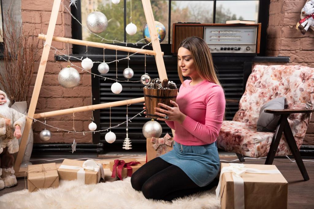 Bordeaux, Tannengrün oder Saphirblau setzen kraftvolle Punkte, ohne zu dominieren. Drei Wiederholungen reichen: Vase, Buchrücken, Kissenpaspel. Welche Akzentfarbe begleitet Ihre Jahreszeit? Kommentieren Sie Ihren Favoriten und entdecken Sie Community-Ideen.